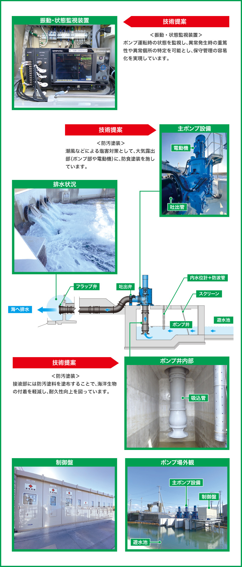 | 斜流ポンプ(立軸) | 型式:800PSV(一床式) 台数:3台 吐出し口径:800mm 電動機出力:100kW 全揚程:5m 吐出し量:80.4m3/min |