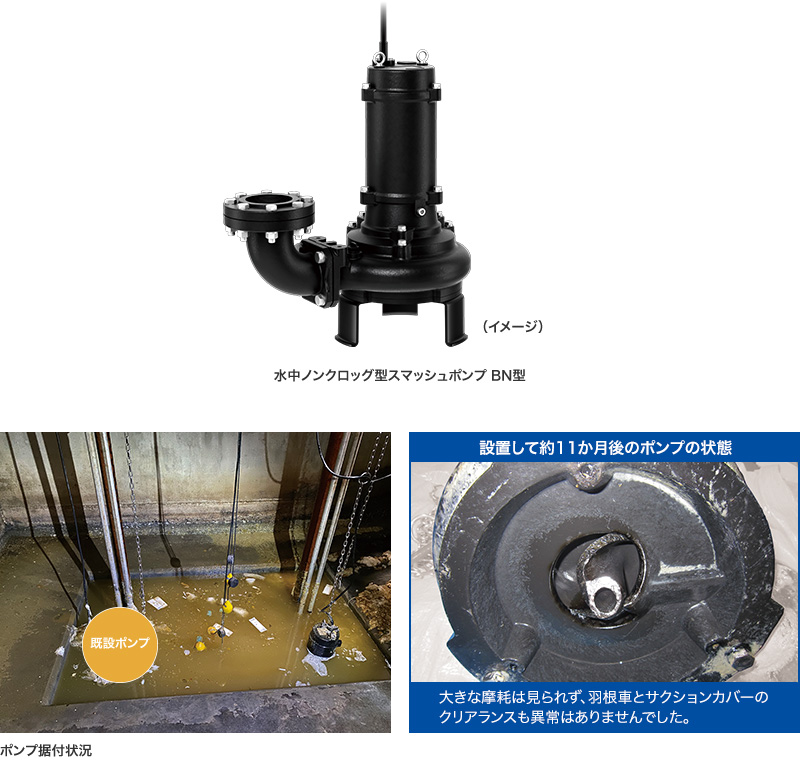 札幌営業所駅の地下歩行空間の汚水排水設備向けに、水中ノンクロッグ型スマッシュポンプ BN型を納入いたしました。もともと設置されていたポンプは、汚水槽内に流れ込む様々な異物により頻繁に閉塞しており、月に数回ポンプを引き上げ、異物を撤去する作業が必要でした。そこで、「スマッシュ機構」によりポンプの閉塞リスクを大幅に低減するBN型をご提案し、試験運用による性能の実証を得てご採用いただきました。メンテナンスの負担が大幅に軽減され、設備管理の省力化にも貢献できました。