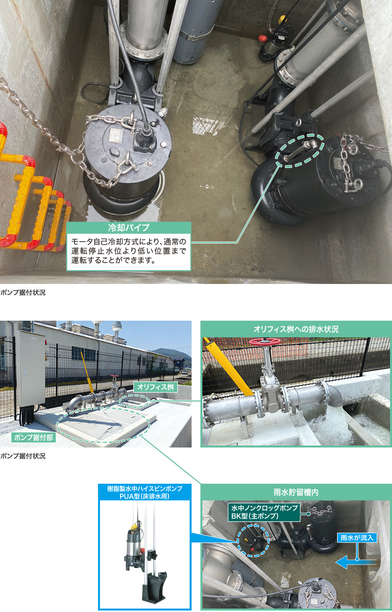 熊本営業所宅地造成地の雨水ポンプ場における主ポンプとして水中ノンクロッグポンプ BK型、及び床排水用に樹脂製水中ハイスピンポンプ PUA型を納入いたしました。今回の現場は、排水先への流量に制約があるため、雨水貯留槽内に流入する雨水をポンプでオリフィス桝へ排水し、水量を調整のうえ排水しています。機種選定からポンプの設置箇所の検討など、当社から技術提案を行い現場に適した仕様をご提案しました。納入実績もあり信頼あるメーカーとして評価いただきました。