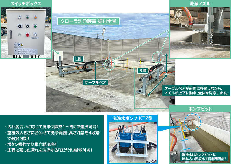 岡山営業所岡山県内の建機レンタル会社様へ、レンタル返却後の重機のクローラ洗浄用にクローラ洗浄装置 TCW型を納入いたしました。当初設置されていた洗浄機械では十分に洗浄できないという課題があり、TCW型の洗浄ノズルと水中ポンプによる優れた洗浄力をご紹介し、ご採用いただきました。ボタンのみの簡単操作で自動洗浄でき、レンタル返却後すぐに洗浄を行うことが可能なため、業務負荷の低減に大きく貢献している点も高く評価いただきました。