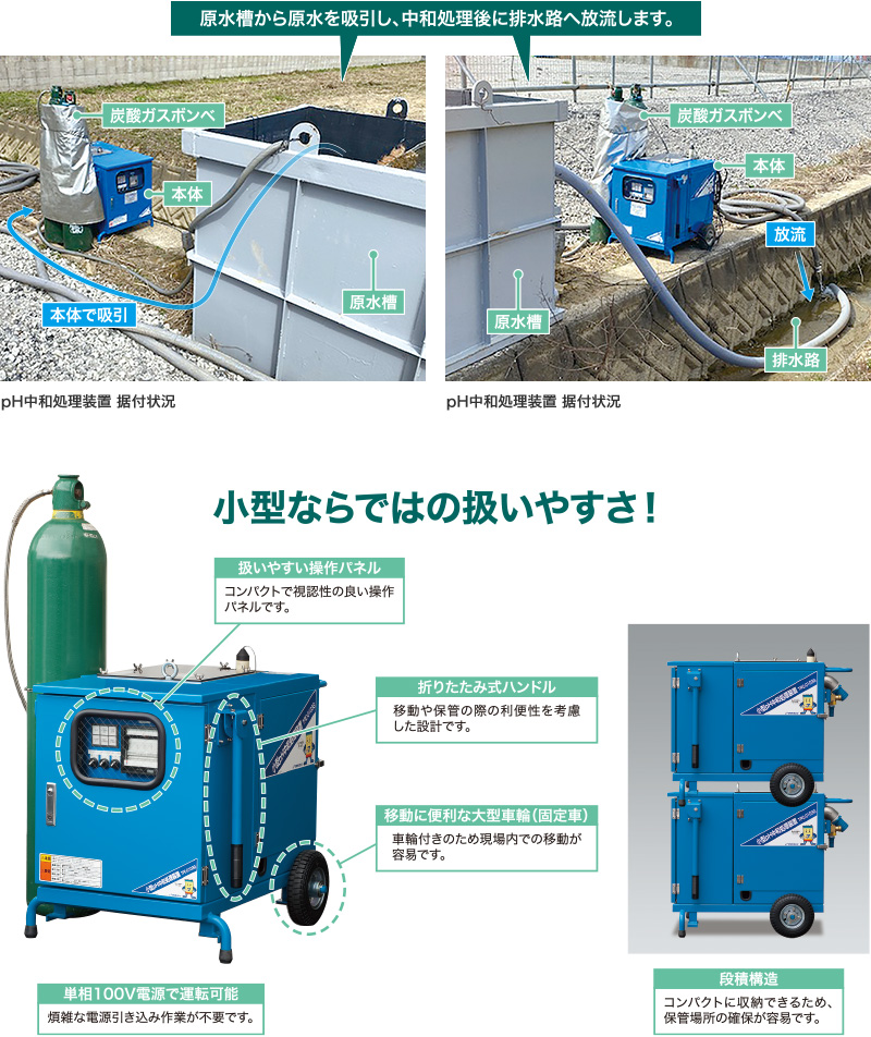 九州建機営業所福岡県内の建設工事現場において、工事中に発生するアルカリ性排水を中和処理するために小型pH中和処理装置 TPC型をご採用いただきました。移動式の小型タイプのため、工事工程に合わせて必要な場所に移動させることができる手軽さと、小型ながら要求処理量を確保できた点など、ご好評いただいております。
