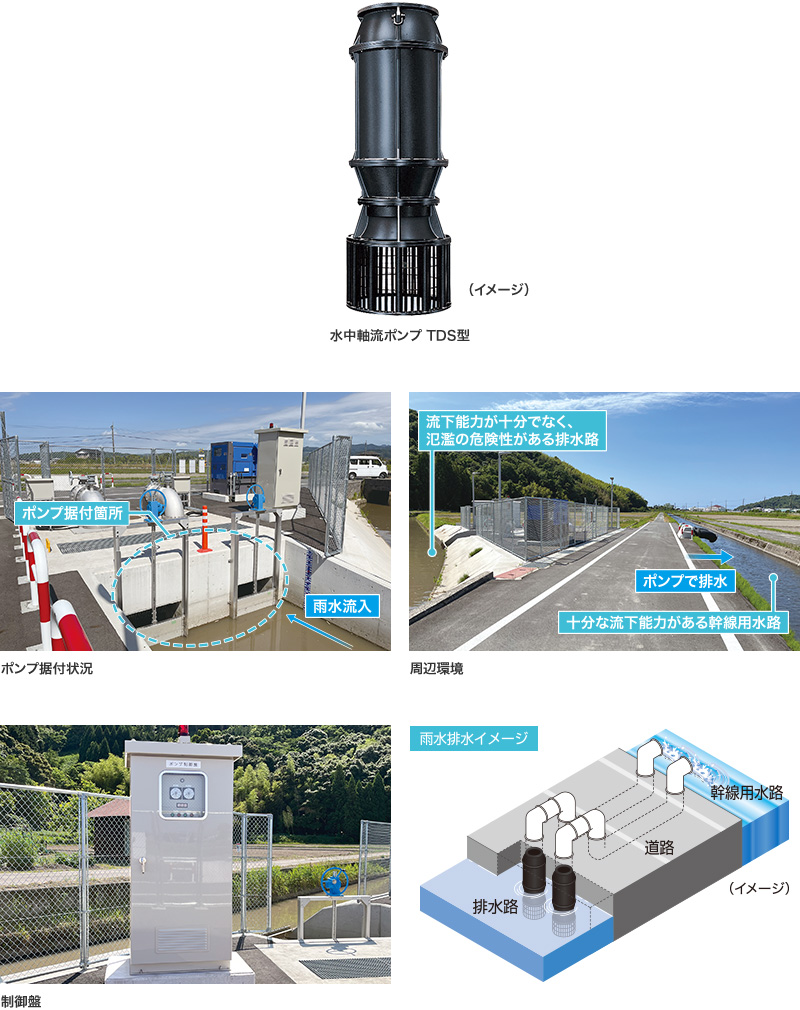米子営業所豪雨発生時の浸水対策に貢献する雨水排水ポンプ場に、水中軸流ポンプ TDS型を2台、及び制御盤を納入いたしました。周辺地区の排水路は流下能力が十分でなかったため、過去に大雨により地域一帯が冠水し、住民の孤立や住宅の浸水被害が発生していたため、今回当ポンプ場が新設されました。ポンプ設置後に発生した豪雨の際には、降り始めから3日間連続で稼働し、浸水被害を最小限にできたと高評価をいただきました。