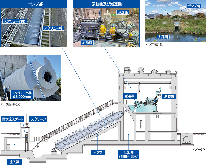 ポンプシステム部鳥取市吉成ポンプ場の雨水排水ポンプ設備として、スクリューポンプ AS型、及び原動機や減速機、流入ゲートなどを一式納入いたしました。本ポンプ場では、既設スクリューポンプ1台が稼働していましたが、近年の豪雨による降雨量の増加により、周辺地域では浸水被害が心配されていました。こうした状況を受け、今回新たにスクリューポンプを増設し、排水能力の強化が図られました。