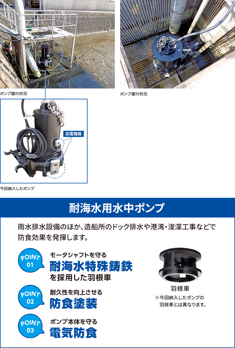 広島営業所芦田川の下流に位置する排水機場において、雨水排水用ポンプの更新に際し、水中ノンクロッグポンプ BK型を納入いたしました。当排水機場には立地上、海水が流入する場合がありましたが、既設ポンプは対策がされておらず、腐食によるポンプの故障リスクが懸念されていました。そこで、海水による腐食を防ぐ耐海水仕様(B仕様:汎用仕様)にてご提案し、当社の防食技術にご納得いただき採用に至りました。ポンプの耐久性・耐食性向上により、地域を浸水から守る内水排除設備の安定稼働に貢献しています。