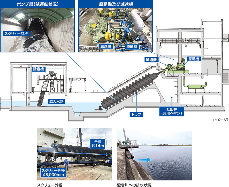 | スクリューポンプ | 型式:3000AS 台数:2台 スクリュー外径:φ3,000mm 原動機出力:350kW 全揚程:6.3m 吐出し量:204m3/min |